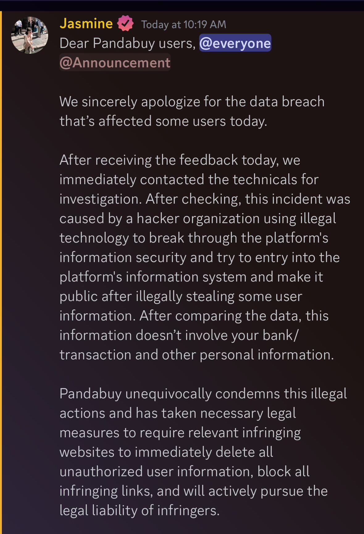 Затем администратор Discord-канала компании сообщил, что инцидент с утечкой данных произошел в прошлом, утечка является старой, данные пользователей не пострадали, а команда безопасности PandaBuy оперативно отреагировала на проблему.