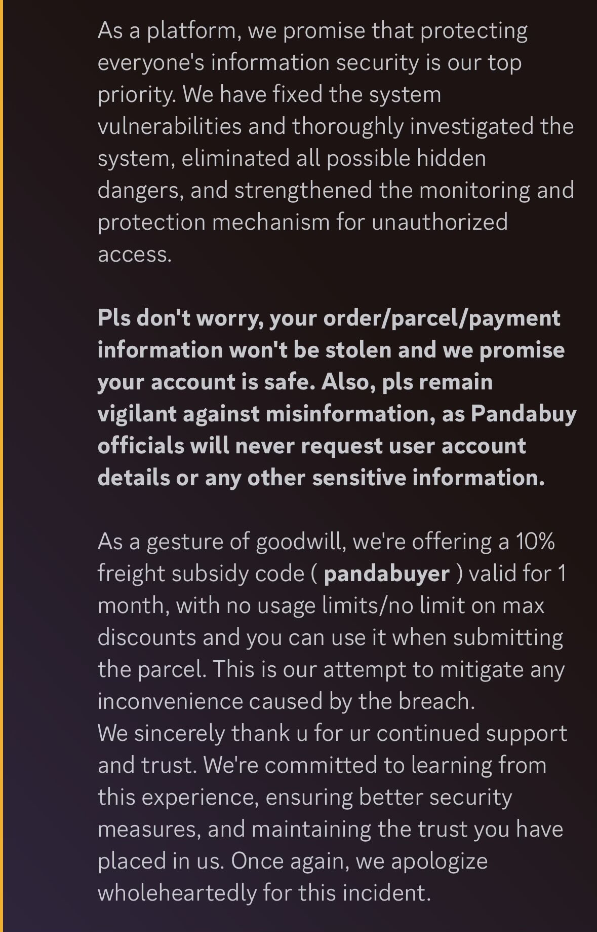 После этого представители PandaBuy все же опубликовали официальное заявление, в котором наконец признали факт взлома. В PandaBuy не сообщили никаких подробностей о количестве или характере украденных данных, но подчеркнули, что финансовая информация клиентов не пострадала.